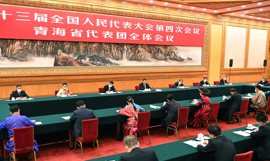 在认真听取代表发言后,习近平作了讲话。习近平充分肯定青海一年来工作和“十三五”时期发展,希望青海的同志全面贯彻落实党中央决策部署,完整、准确、全面贯彻新发展理念,坚持以人民为中心,坚持稳中求进工作总基调,持续深化改革开放,统筹发展和安全,弘扬光荣传统和奋斗精神,把坚持生态优先、推动高质量发展、创造高品质生活部署落到实处,在推动青藏高原生态保护和可持续发展上不断取得新成就,书写新时代青海新篇章。