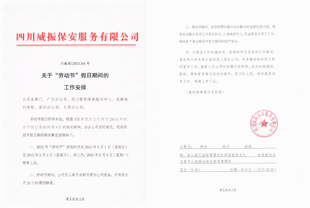 关于“劳动节”假日期间的工作安排