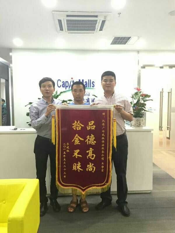 2015年5月25日,失主送来了“拾金不昧,品德高尚”的锦旗赠与王净富,同时还对凯德•金牛广场物业领导和保安部经理表示感谢,感谢凯德 • 金牛广场和E乐彩拥有一支高素质、 高质量的服务团队。 失主十分感慨社会地位不高、 收入不丰的保安员不为20000余元的现金、苹果手机、 银行卡和证件卡所动,对拥有拾金不昧的高品质, 专业的职业道德更是肃然起敬。对王净富这种拾金不昧的态度进行表扬,也为他的行为感到骄傲,为我们公司有这样的员工而感到自豪,同时号召公司所有同仁以他为榜样,不断强化自身素质,提升服务质量。为创建“服务第一,品质至上”的民营保安服务企业而共同努力!