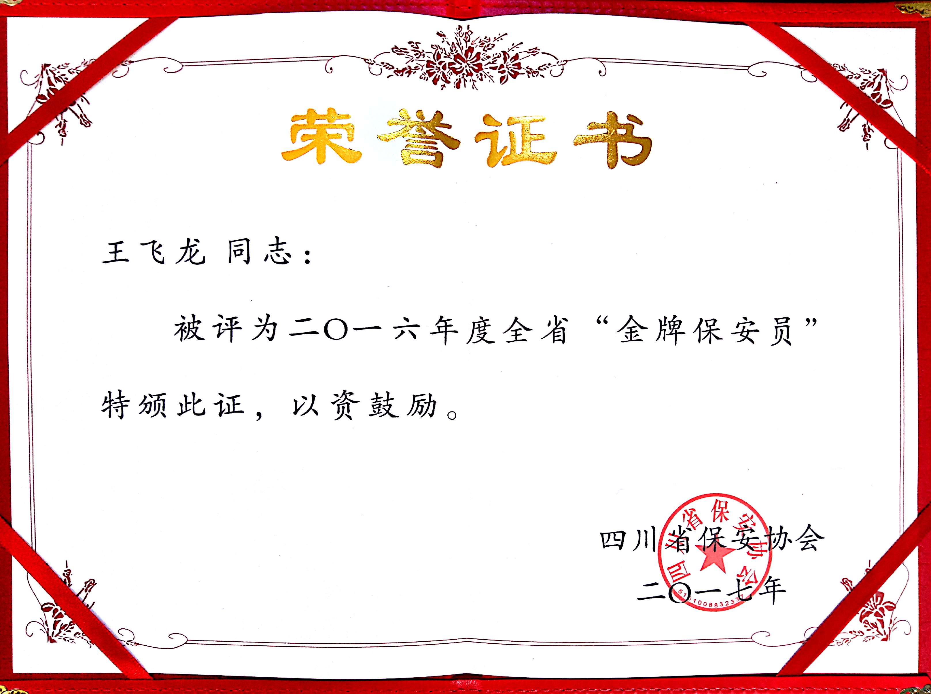 在本次评选中,公司保安队员王飞龙、赵麒皓同志也因其在行业中特别突出的表现,分别获得了“金牌保安员”、“先进保安员”光荣称号。