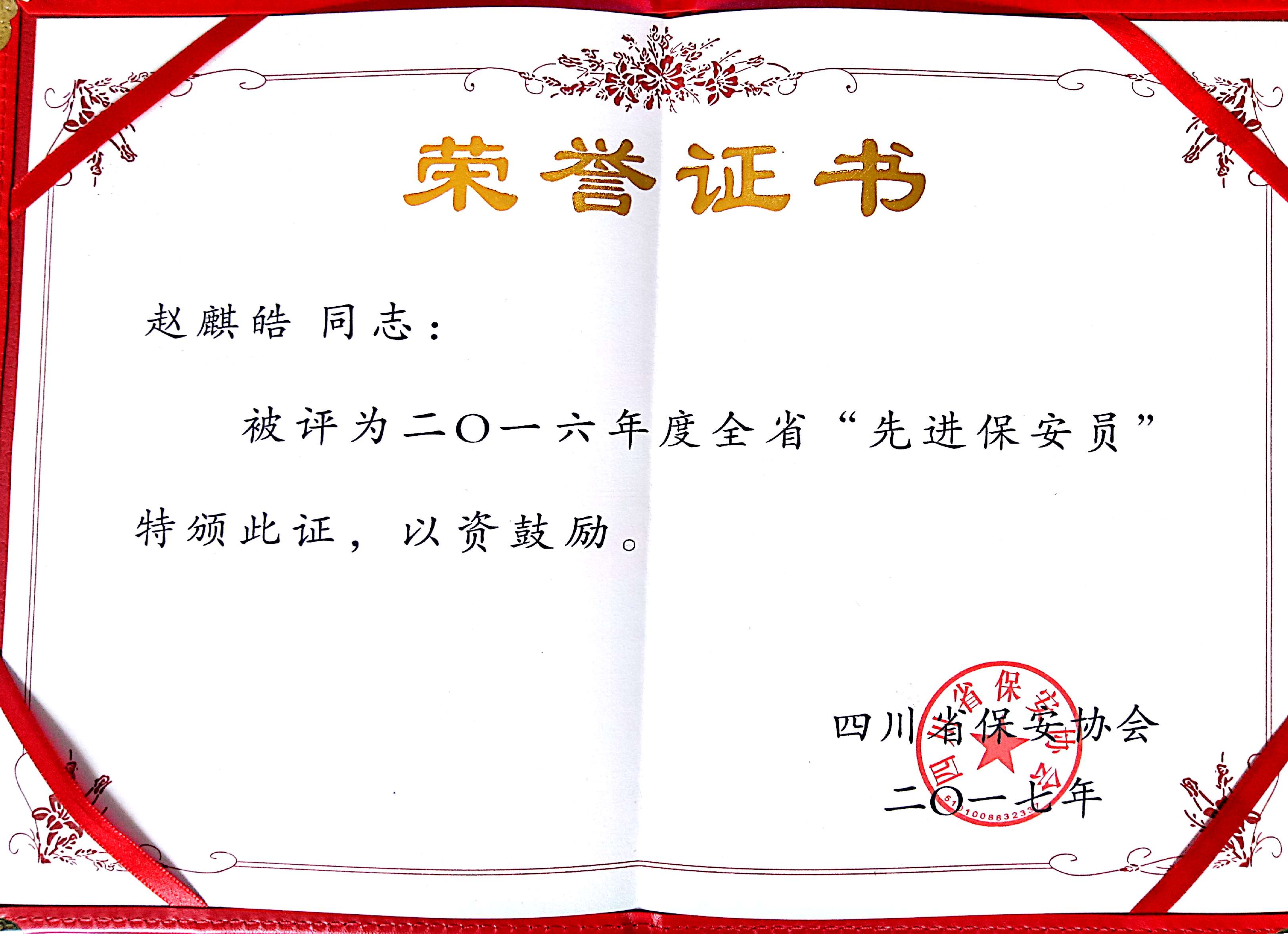 2017年3月28日,四川省保安协会四届二次理事会在绵阳召开,四川省公安厅治安管理总队副总队长张勇、四川省保安协会副会长王冰、四川省保安协会副会长赵久明、四川省保安协会秘书长何辉元、副秘书长谢意等领导出席了会议。会上,全省先进保安服务公司受到了表彰。E乐彩荣获2016年度全省“优秀保安服务公司”、2016年度全省保安行业“安全无事故优胜单位”、“服务质量优胜单位”荣誉称号。我司保安员王飞龙荣获2016年度全省“金牌保安员”光荣称号、赵麒皓荣获“先进保安员”光荣称号。