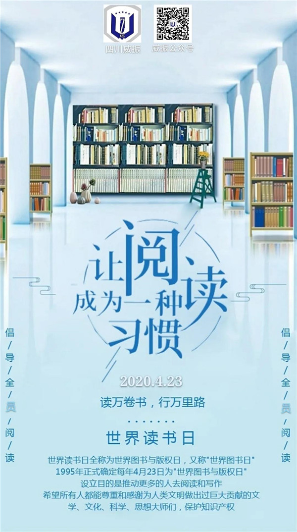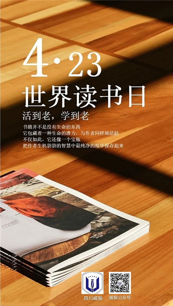 为迎接第25个“4.23世界读书日”四川威振倡议全员一起读书。热爱读书,让阅读成为我们最优雅的生活态度;热爱读书,让阅读成为家庭最常态的生活方式;热爱读书,让阅读成为人生最美好的生活习惯。